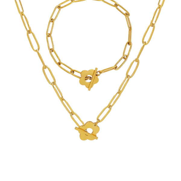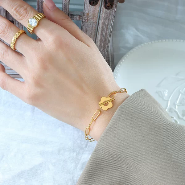 Et elegant armbånd i guldtone med papirclips-kæde og en blomsterformet lås, der kombinerer moderne enkelhed med et strejf af naturinspireret elegance.