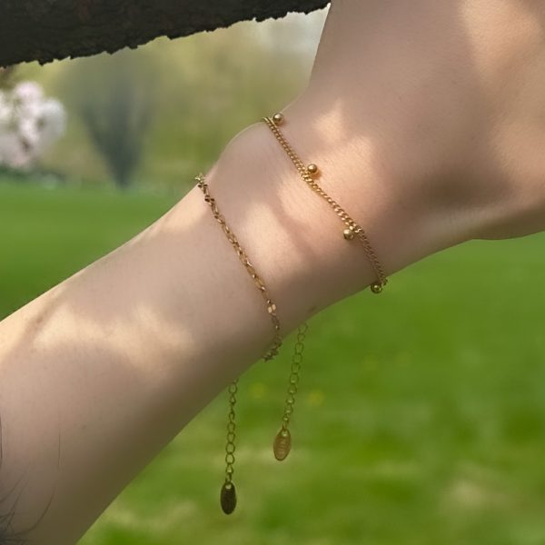 Et delikat armbånd med kugledetaljer og justerbar kæde (15+5 cm), fremstillet i 18K guldbelagt rustfrit stål. Vand- og svedfast, hypoallergent og modstandsdygtigt over for ridser, rust og misfarvning. Perfekt til daglig brug og enhver anledning.