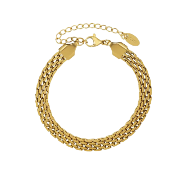 Forkæl dig selv eller en du holder af med dette smukke armbånd i forgyldt rustfrit stål. Guldflet 18k Armbånd er designet med tre fine kæder, som elegant flettes sammen og skaber et sofistikeret udtryk. Den blankpolerede overflade giver et luksuriøst touch, mens den justerbare kæde med lås sikrer en perfekt pasform til alle håndled.