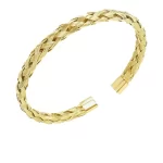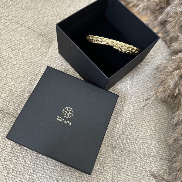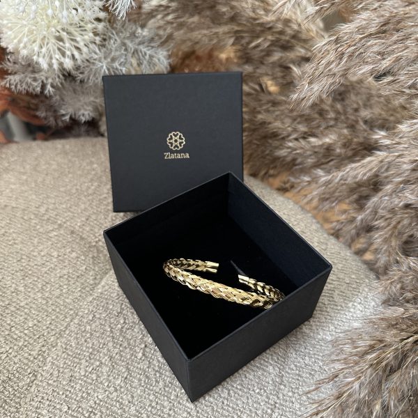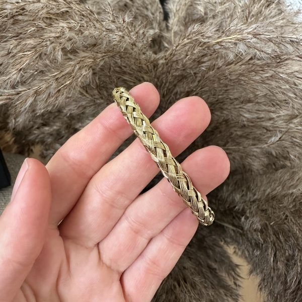 En smuk guldfarvet armbånd med et indviklet vævet design, perfekt til at tilføje elegance til ethvert outfit.