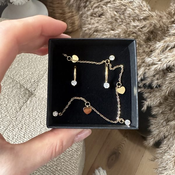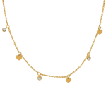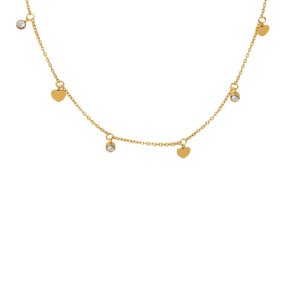 “Hjerteglimt” er en fin og romantisk halskæde, hvor små hjerter og funklende sten spiller harmonisk sammen. Det elegante design fremhæver smykkets lette og luftige udtryk, hvilket gør det til et oplagt valg for både hverdag og fest.