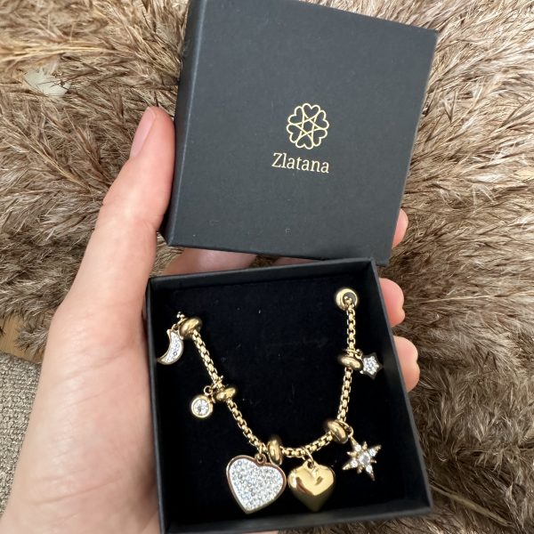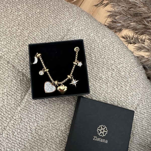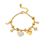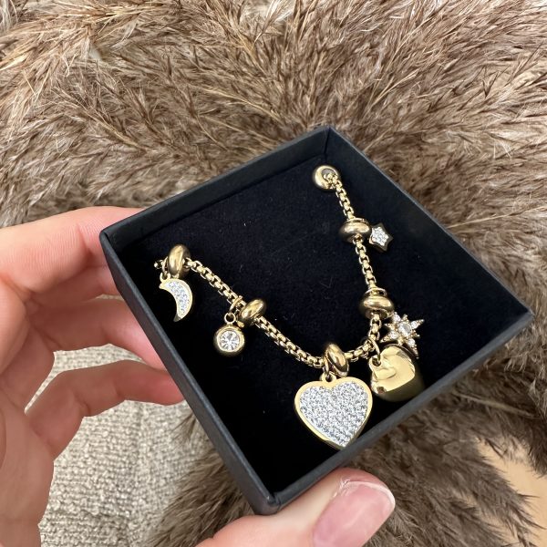 Et charmerende armbånd i guldtone, prydet med himmelske stjerner, en halvmåne og hjertevedhæng, nogle med funklende krystaller, perfekt til et romantisk og drømmende udtryk.