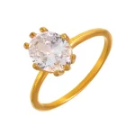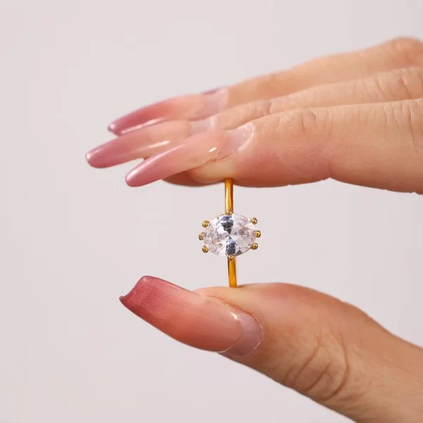 Strålende Blomst ringen indfanger essensen af evig elegance med sit 18k forgyldte rustfri stålbånd, kronet af en funklende oval kubisk zirkonia ædelsten. Stenen glimter med en blød, æterisk glød, der minder om en blomstrende blomst kysset af morgendug, hvilket gør den til et tidløst stykke til enhver lejlighed.